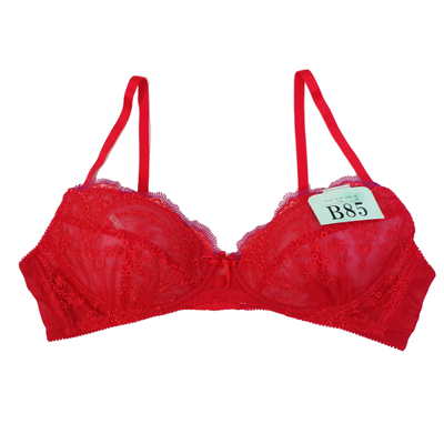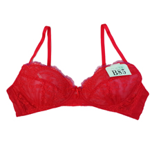 鮮やかなレッドが胸元を飾るエレガンスなブラジャーです。カップ上部に紫色のレースがワンポイントに。
