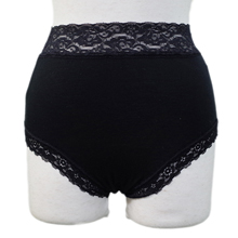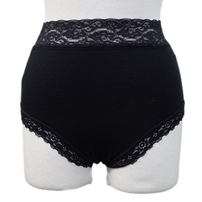 ウエストと太もも部分に広めのレースが施され、ハイウエストタイプでお尻を包み込むような履き心地です。