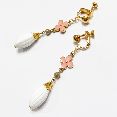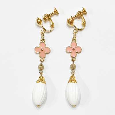 ミルキーピンクの可愛らしいお花に、つぼみのようなホワイトカラーのビーズのイヤリングです。